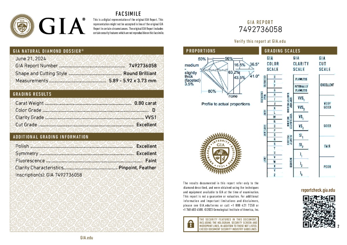 Round Shape, 0.80 Carat, D Color, VVS1 Clarity