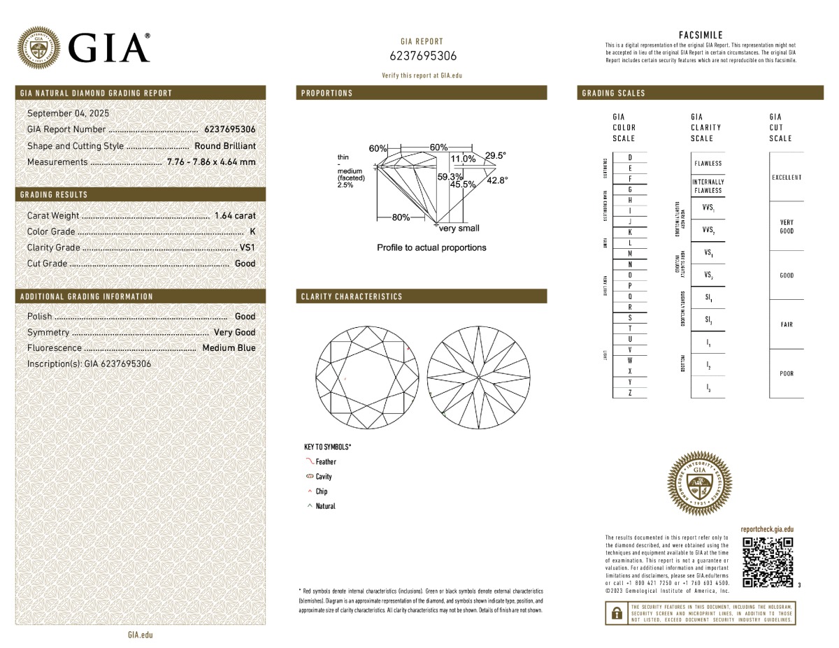 Round Shape, 1.64 Carat, H Color, SI1 Clarity