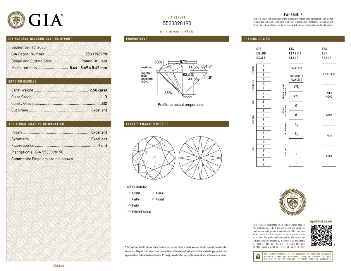 Round Shape, 2.50 Carat, D Color, SI2 Clarity
