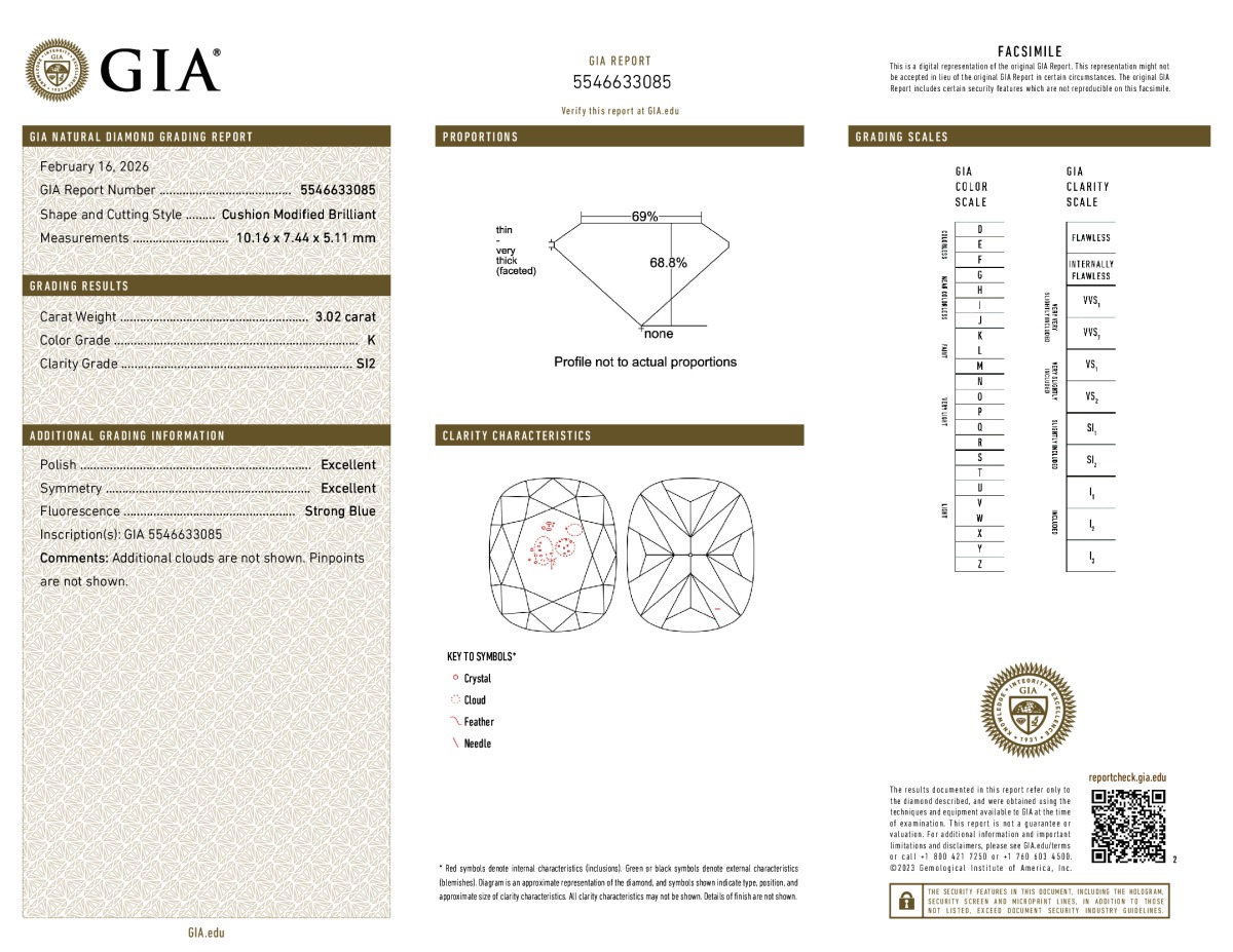 Cushion Shape, 3.02 Carat, K Color, SI2 Clarity