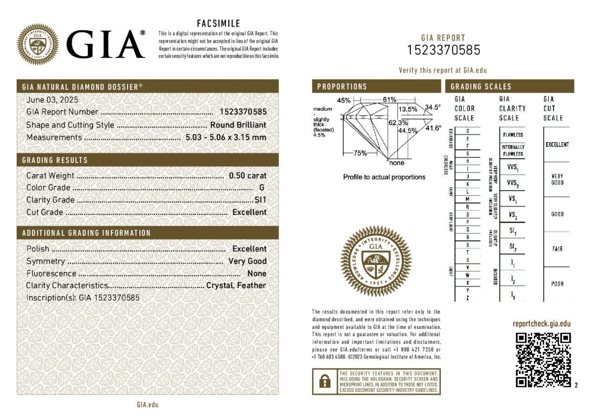 Round Shape, 0.50 Carat, G Color, SI1 Clarity