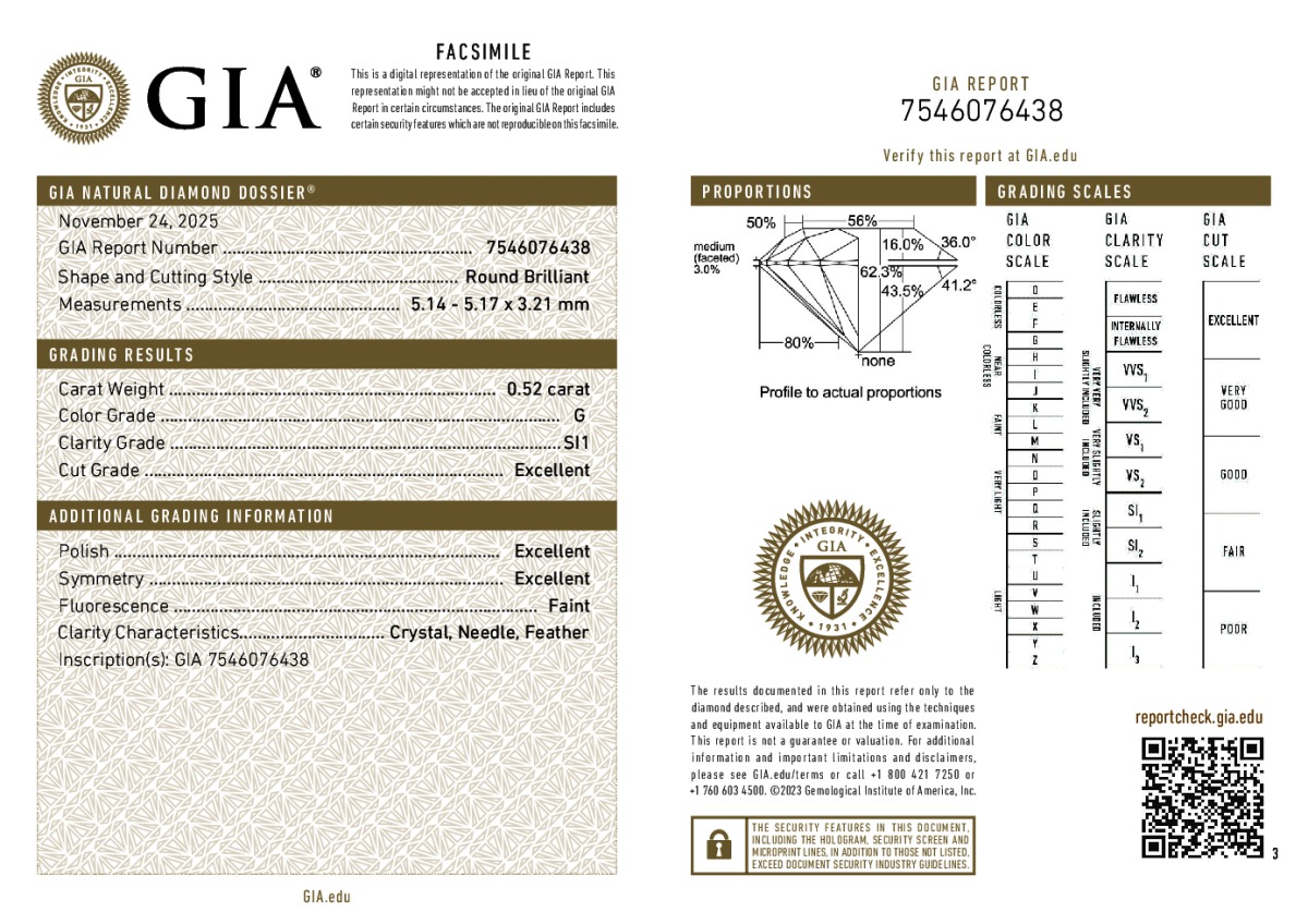 Round Shape, 0.52 Carat, G Color, SI1 Clarity