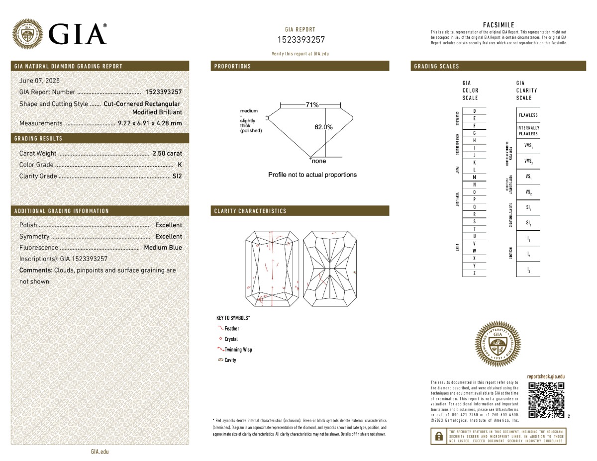 Radiant Shape, 2.50 Carat, K Color, SI2 Clarity